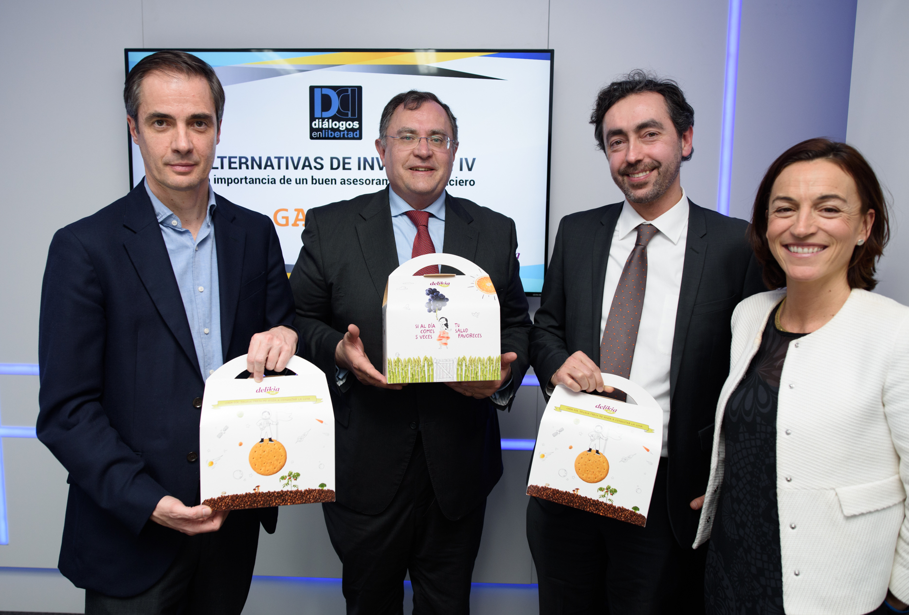Asier Uribeechebarría, director general de la agencia de valores Finanbest, Ramón Alfonso, socio director de inversiones de la EAFI GAR Investment Advisors y Román Gris, director de banca privada de GAR, posan junto a Cristina Cal, directora general de Delikia Fresh, que ofrece el desayuno en Diálogos en Libertad y obsequia a los participantes con una cesta de alimentos frescos y café.