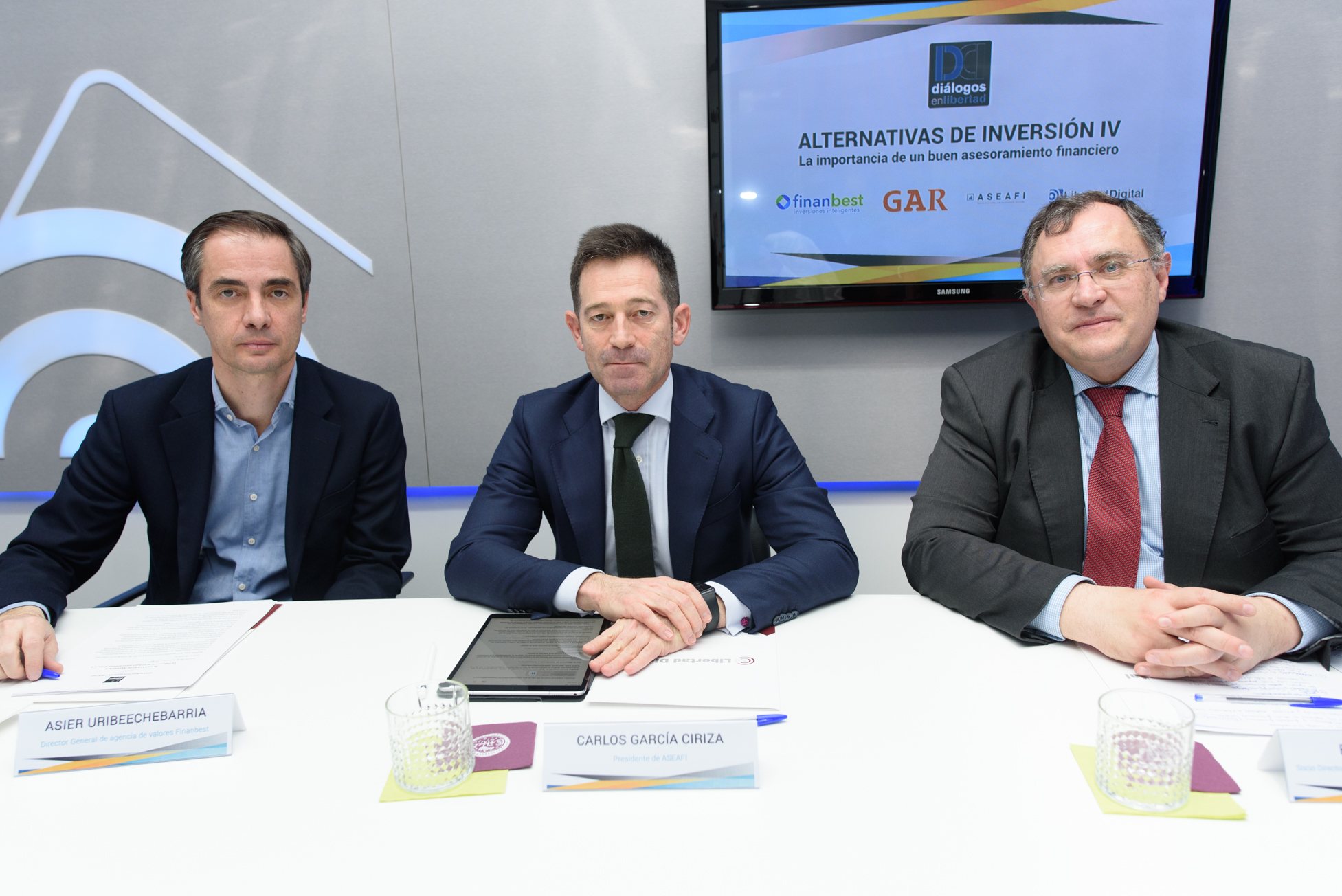 Asier Uribechebarría, de Finanbest, Carlos García Ciriza, de ASEAFI y Ramón Alfonso de GAR Investment Advisors EAFI, en Diálogos en Libertad.