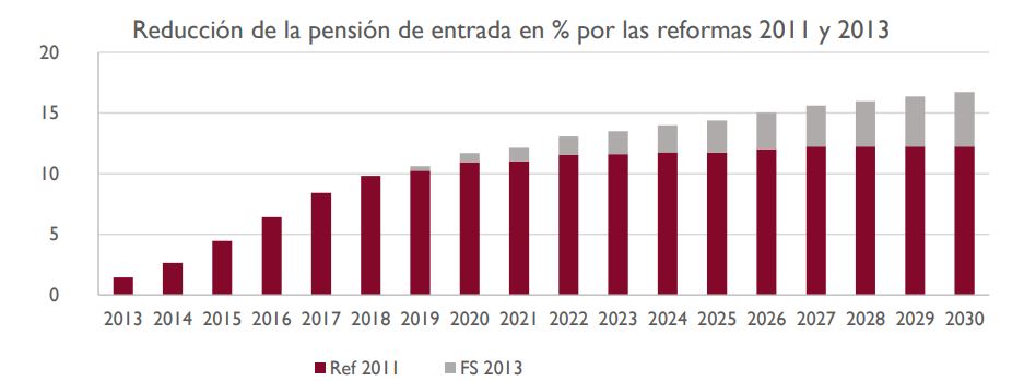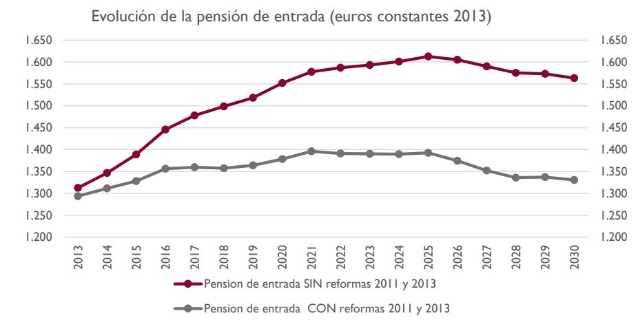 Como puede verse en el gráfico de arriba, según estas previsiones, en 2030, la primera pensión que cobren los nuevos jubilados españoles será más de un 15% inferior a la que habría tenido sin las nuevas reglas de acceso al sistema aprobadas en 2011 y 2013.