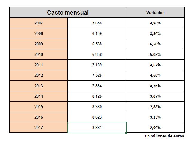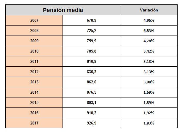 - Pensión media: lo mismo ocurre si miramos a la segunda tabla, que recoge la pensión media desde 2007 a 2017. De nuevo, vemos cómo sigue subiendo (hasta los 926,87 euros al mes en diciembre) pero ese incremento se ha moderado de forma muy sensible en los últimos tres años. Así, mientras que de 2010 a 2013 el ritmo de subida de la pensión media superaba el 3%, desde 2014 lo hace por debajo del 2%. Hay un apunte que hacer aquí: hablamos en términos nominales, por lo que la baja inflación de los últimos años también tiene que ver en esta moderación. Pero no es sólo eso: el nuevo índice de Revalorización de las Pensiones que sustituyó al IPC también está teniendo su peso en esta cuestión. Al fin y al cabo, las prestaciones llevan varios años subiendo un 0,25%: es cierto, como decía la ministra el otro día en el Congreso, que en el conjunto de los años de crisis los pensionistas han mantenido poder adquisitivo; pero no lo es menos que con las reglas antiguas de revalorización ahora las pensiones serían un poco más elevadas (quizás se habrían quedado en el 0% en los años de inflación negativa, pero habrían subido por encima del 1% en los dos últimos ejercicios). De nuevo, la combinación de reformas más crisis modera el gasto en pensiones.