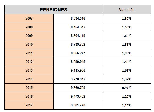 - Número de pensiones: la primera tabla muestra el número de pensiones en vigor a día 1 de cada mes. Como puede verse, en diciembre del pasado año teníamos 9.581.770 pensiones (el número de pensionistas es algo inferior porque hay personas que acumulan varias prestaciones).Esa cifra es un 1,14% superior a la del mismo mes de 2016. Como puede verse en los datos del Ministerio de Empleo, en los últimos tres años se ha producido una reducción significativa del ritmo de crecimiento: de estar por encima (o muy cerca) del 1,5% de incremento al año, hemos pasado a rondar el 1%. El retraso en la edad de jubilación podría estar detrás de parte de esta reducción en el ritmo de incremento de las nuevas pensiones.