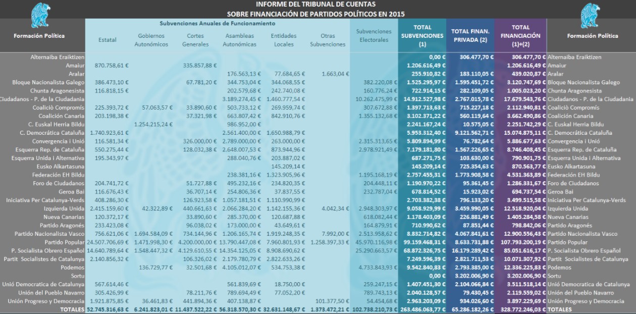 Así, tal y como muestra la detallada recopilación efectuada por @Absolutexe, tras analizar las auditorías anuales que elabora el Tribunal de Cuentas sobre la financiación de los partidos políticos, las diferentes formaciones con representación, tanto a nivel estatal como autonómico y local, han ingresado cerca de 3.000 millones de euros entre 2007 y 2015 -último informe disponible-, a un ritmo medio de 330 millones al año.