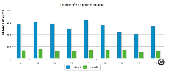 El ejercicio en el que los partidos manejaron más dinero fue 2011, en plena crisis económica, con casi 390 millones, pero lo más relevante es que su financiación se ha mantenido más o menos estable a lo largo de todo este período. Así, mientras que en 2007 las diferentes formaciones ingresaron 350 millones de euros, en 2015 dicha cuantía se situó en 330. Por su parte, 2013 y 2014 fueron los peores años en materia de financiación, con 287 y 255 millones, respectivamente.
