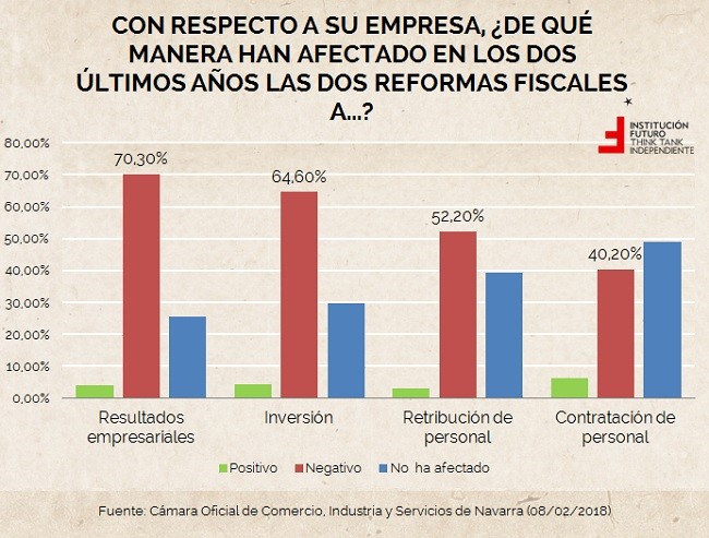 Tras dos años de vigencia de esta norma –entró en vigor en 2016– la Cámara de Comercio, Industria y Servicios de Navarra ha valorado cómo ha afectado a los empresarios de la región. El 70,3% de los empresarios consideran que la reforma fiscal de 2015 y la anterior les ha afectado negativamente en los resultados empresariales. De igual manera, consideran, en un 64,6%, que la nueva normativa ha afectado de manera negativa a la inversión. Mientras que el 52,2% creen que también ha repercutido de forma negativa en la retribución del personal.