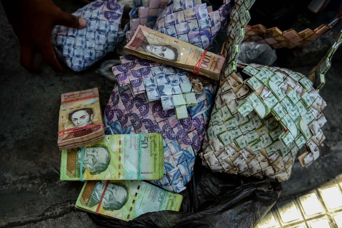 Los billetes de 10, 20, 50 y 100 bolívares ya no valen nada. Son solo papel. Prueba de ello es que, en un intento desesperado de obtener dinero -de verdad-, muchos artesanos venezolanos han comenzado a fabricar bolsos y carteras con estos billetes para venderlos después en la frontera con Colombia.