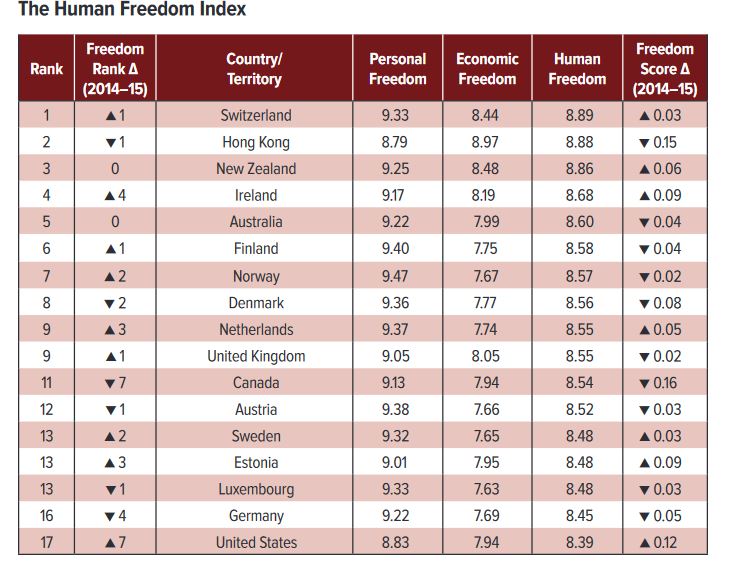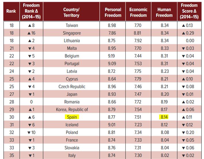 Liderando la clasificación, se encuentra Suiza (8.89), Hong Kong (8,88) y Nueva Zelanda (8,86), considerados los tres países más libres del planeta. En el puesto número cuatro se sitúa un país de la Unión Europea, Irlanda (8,68), que ha avanzado cuatro posiciones respecto a 2015. Alemania (8,45) se coloca en el puesto décimo sexto y Estados Unidos (8,39) en el décimo séptimo. Por delante de España se encuentran también Portugal (8,31), Japón (8,20) y Rumanía (8,19), entre otros. Mientras que por detrás están Francia (8,04) e Italia (8,02)
