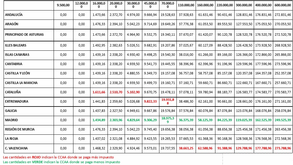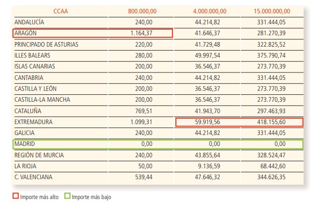 En cuanto al Impuesto sobre el Patrimonio, sin tener en cuenta los 300.000 euros exentos de la vivienda habitual, Aragón, Cataluña y Extremadura aplican el mayor gravamen en activos valorados en 800.000 euros; Extremadura aplica el impuesto más altos en patrimonio de 4 y 15 millones; mientras que Madrid es la única región que ha eliminado de facto este tributo.