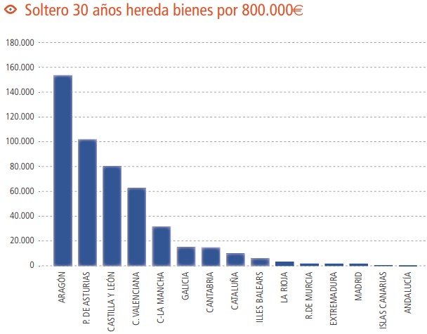 En el caso de un soltero de 30 años que hereda bienes de su padre por un valor de 800.000, de los que 200.000 corresponden a la vivienda del fallecido, Aragón protagoniza la mayor mordida en Sucesiones, con más de 150.000 euros, seguida de Asturias y Castilla y León. Andalucía, por el contrario, se sitúa en la cola con 0 euros, tras la reciente reforma aprobada por PSOE y Ciudadanos, seguida de Canarias, Madrid, y Extremadura.