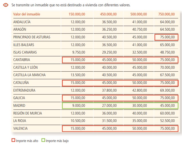 Por último, en caso de transmitir un inmueble que no está destinado a vivienda, Madrid sigue siendo la autonomía con menor carga fiscal, con independencia del valor del activo, mientras que Cataluña, Galicia, Valencia y Cantabria aplican la mayor tributación.