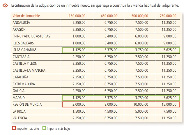 Y lo mismo sucede en caso de escriturar la compra de un inmueble nuevo, sin que vaya a constituir la vivienda habitual del adquirente, ya que el impuesto de Actos Jurídicos Documentados oscila entre los 1.125 y 5.625 euros en Madrid y Canarias, en función del valor de piso, a una gran distancia del máximo que impone Murcia (entre 3.000 y 15.000 euros).