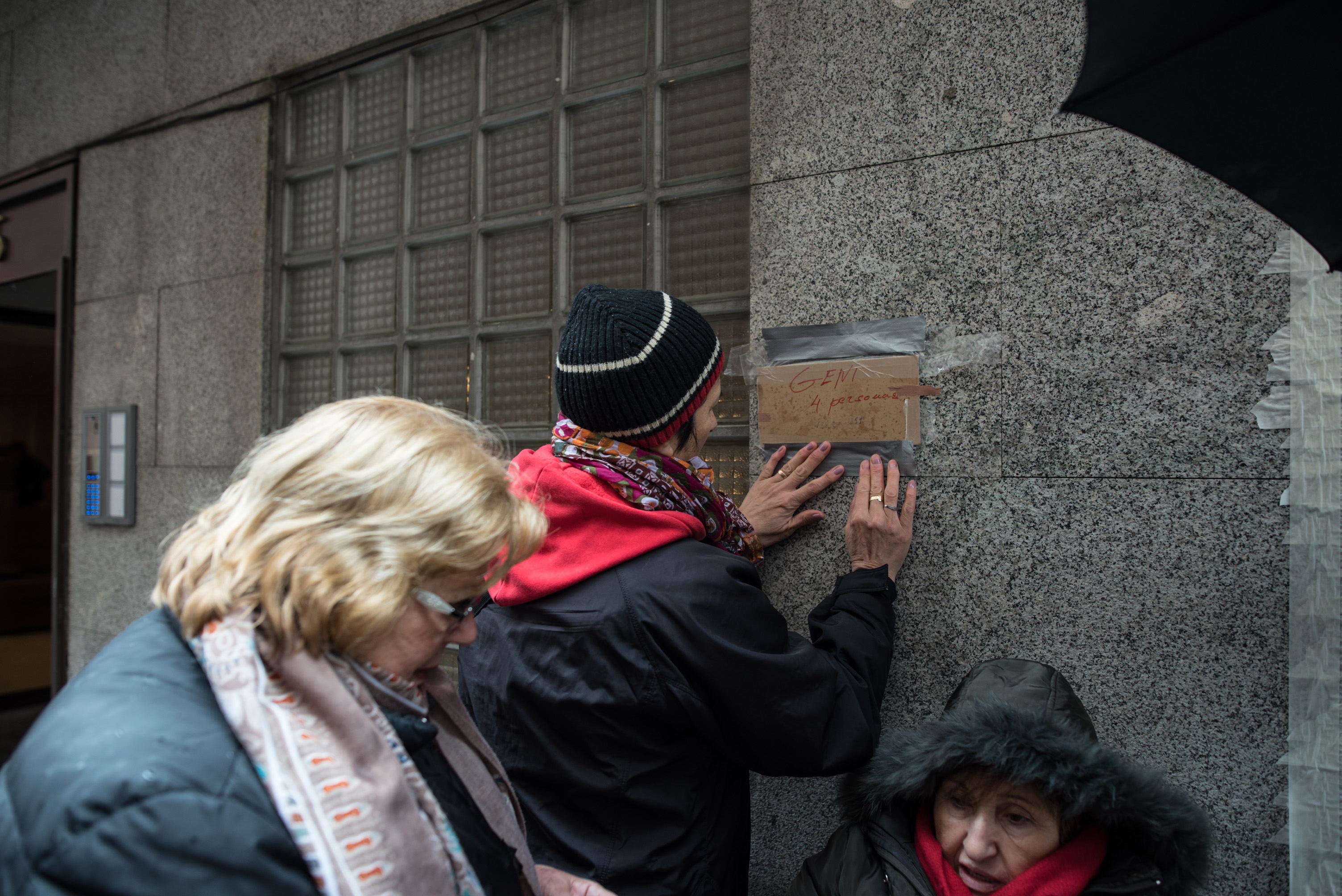 Una mujer coloca un cartel en la fachada con su nombre y las personas que se colocarán en la cola en esa posición.