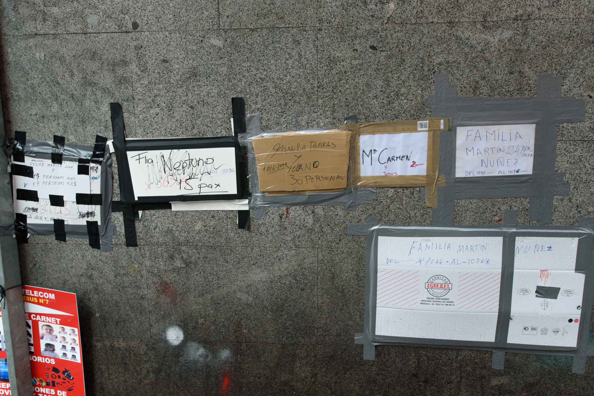 Varios carteles pegados en la pared con los nombres de las personas y su orden en la cola. Para respetar el turno en la cola y mantener un orden se llevan a cabo este tipo de prácticas.