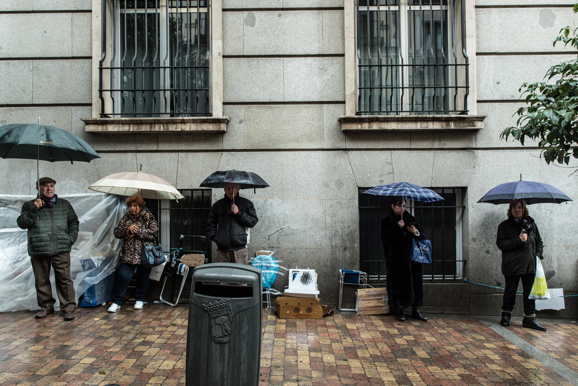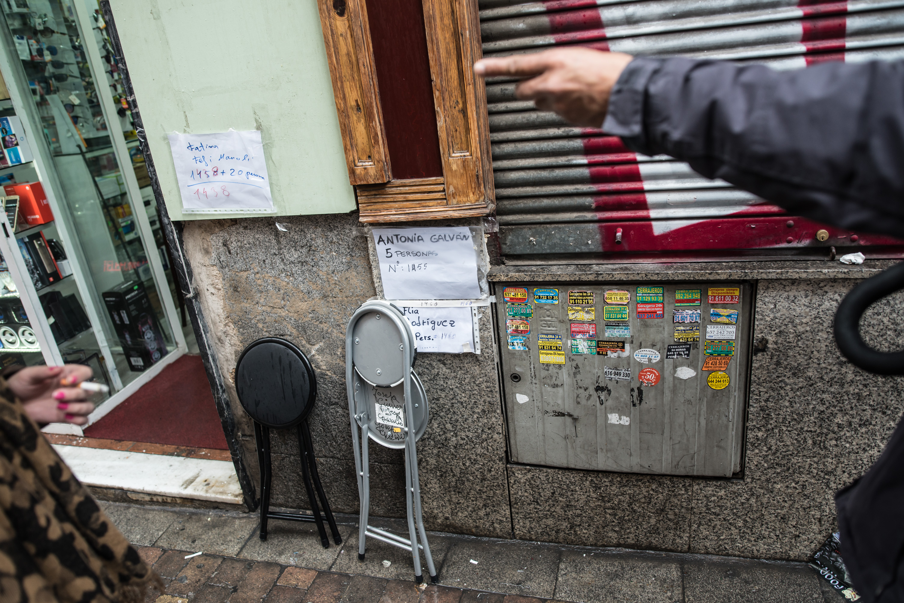 Los primeros puestos de la cola en la calle de la Basílica de Jesús de Medinaceli están reservados desde hace días. Aunque sus titulares no estén presentes, algún objeto o silla con el nombre de su dueño guardan el sitio.