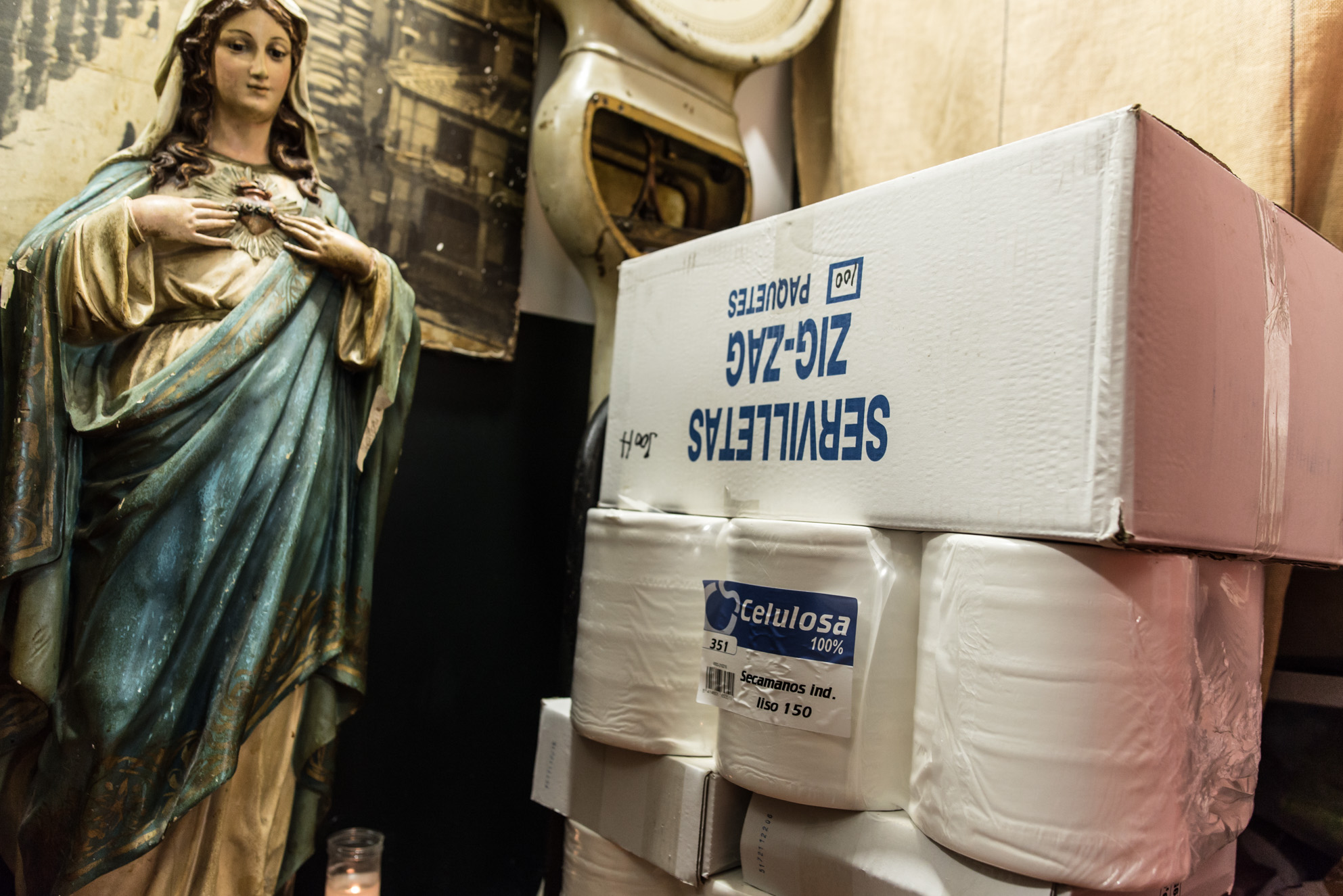 Cajas de servilletas y papel se acumulan en el interior del bar Los Gatos, al lado de una imagen de la Virgen del Sagrado Corazón. Los días previos a la apertura de las puertas de la basílica del Cristo de Medinaceli los bares y establecimientos de la zona se preparan para la gran afluencia de clientes.