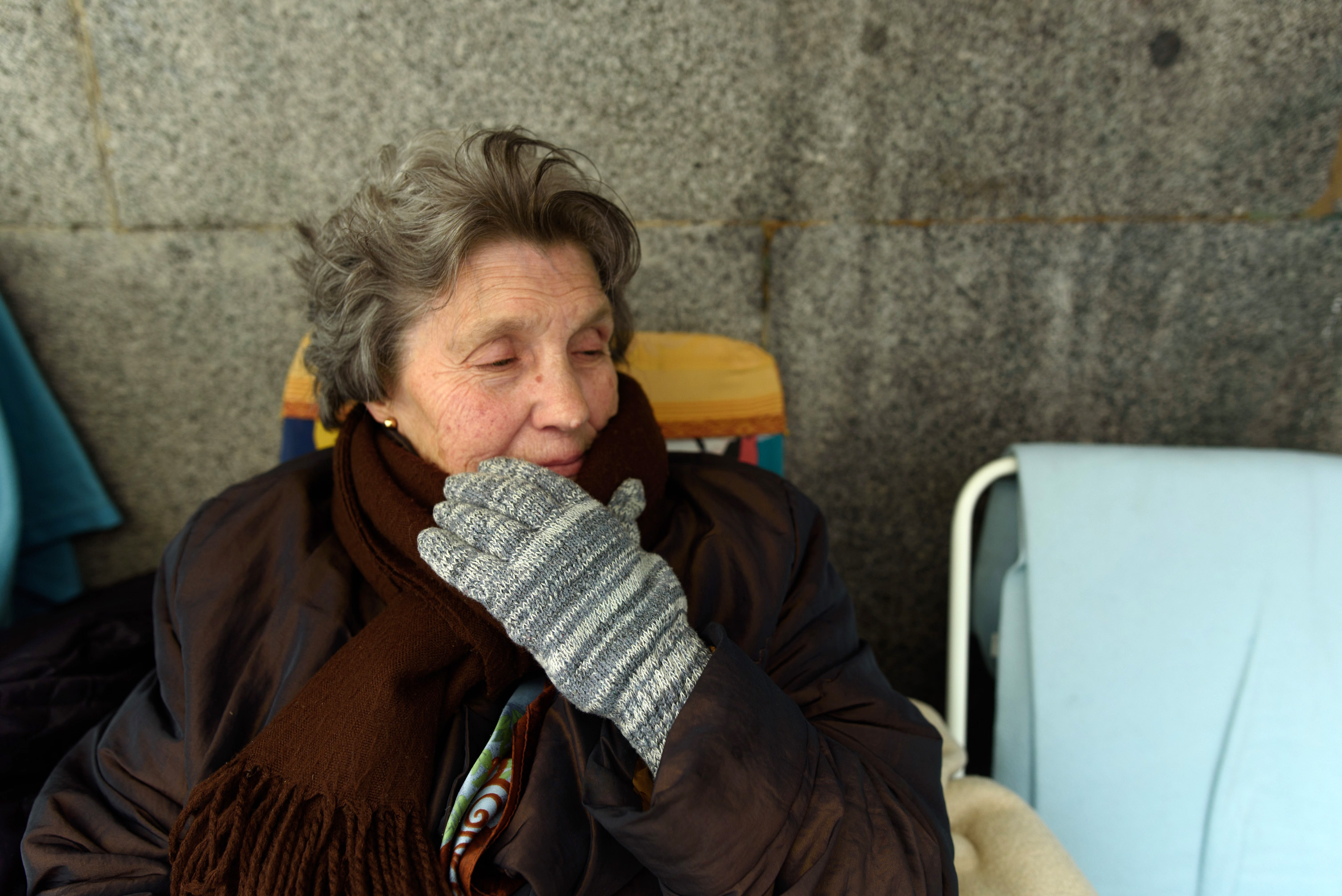 En una hamaca está Paca, de 83 años. Conocida por todos los fieles en la cola, se protege con guantes y bufanda. El frío y la lluvia están muy presentes durante la larga espera diaria.