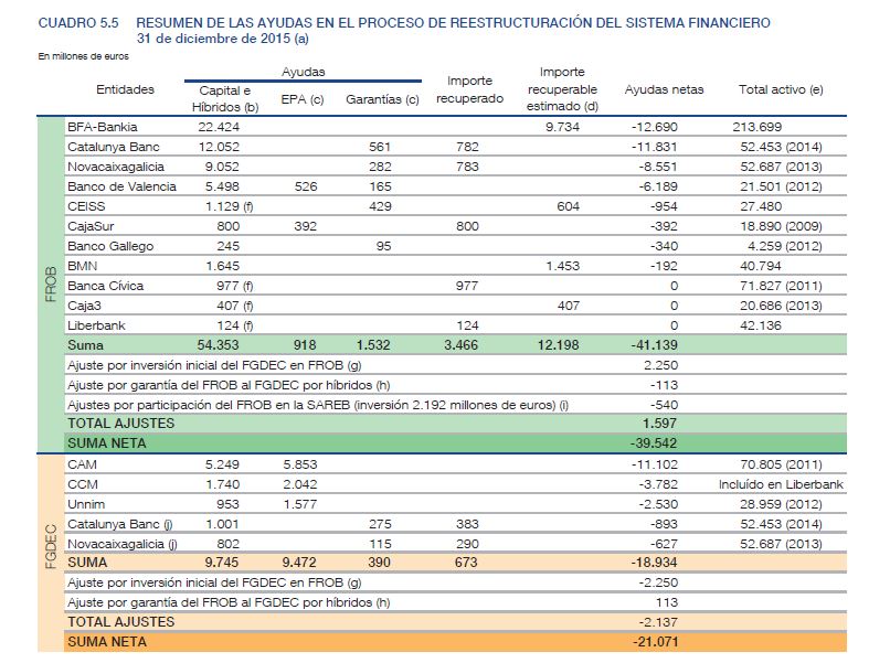 En el cuadro resumen al final del artículo puede verse el desglose que hace el Banco de España, a 31 de diciembre de 2015, de las ayudas recibidas por las entidades financieras rescatadas. Como puede apreciarse a primera vista, no es sencillo determinar cómo se reparten estas (aunque el organismo regulador hace un muy buen trabajo en esta tabla – página 246 del informe). Tenemos ayudas públicas directas, inyecciones de capital, compra de instrumentos de deuda convertible que al final se convirtieron, inyecciones desde el Fondo de Garantía de Depósitos…