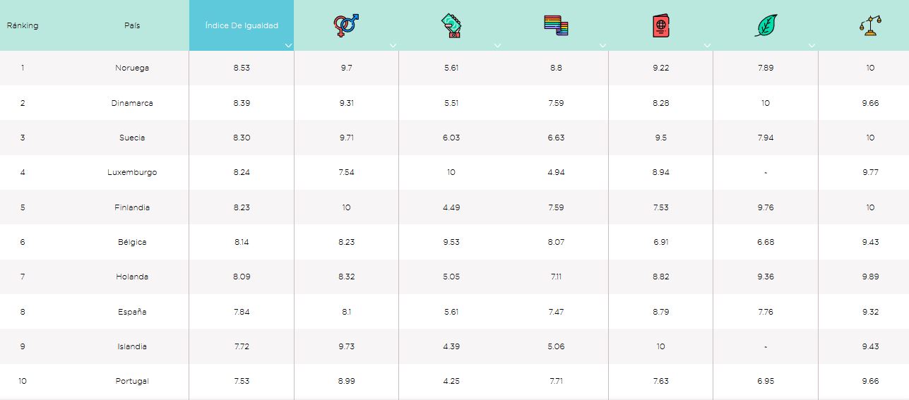 En el estudio se analiza la presencia laboral de hombres y mujeres, la brecha salarial, la calidad de vida, el racismo, los derechos políticos y la aceptación del colectivo LGTBI. Como nota media, entre todas las categorías estudiadas, España ha logrado un 7,84 sobre 10 -a solo siete décimas de Noruega, que ocupa el primer puesto-.