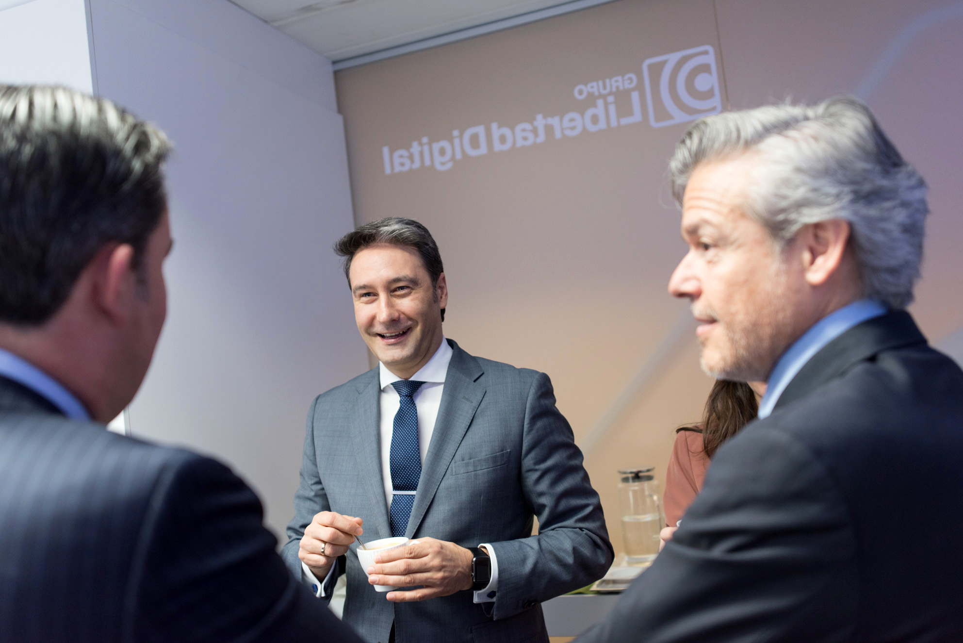 Alberto Leonardo, socio de LBS Abogados, charla junto a Carlos Antón Mérida, socio de Nexum Legal, con José Luis Ruiz Bartolomé (de espaldas) minutos antes de empezar el desayuno informativo sobre Vivienda, hipotecas y Tribunales, en Libertad Digital