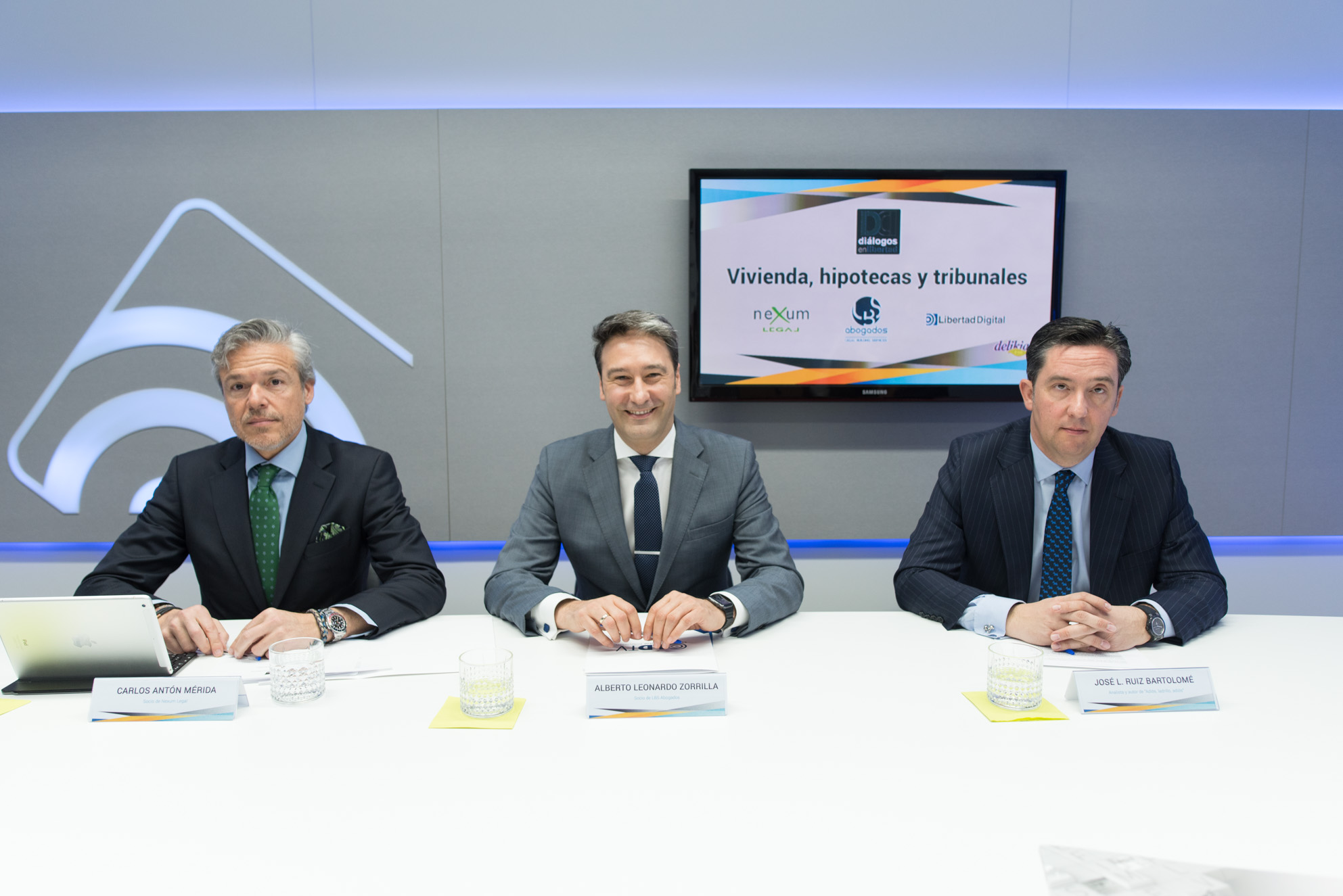 Los tres expertos que han participado en el desayuno informativo sobre la evolución del mercado inmobiliario e hipotecario, en Libertad Digital, Carlos Antón Mérida (d), socio de Nexum Legal, Alberto Leonardo (c), socio de LBS Abogados y José Luis Ruiz Bartolomé (d), autor de Adiós, ladrillo, adiós y Vuelve, ladrillo, vuelve, han profundizado en las causas y consecuencias del estallido de la burbuja inmobiliaria así como los problemas que ha ocasionado a tanta gente que ha sufrido cláusulas abusivas en sus hipotecas y que todavía padece defectos de forma en sus propias viviendas.