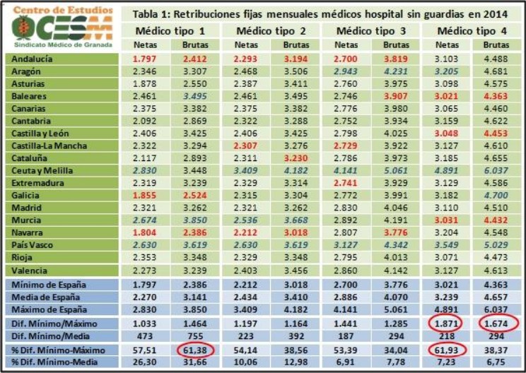 Sin embargo, en el caso de los médicos las diferencias de retribución en términos netos oscilan entre los 1.033 y los 1.871 euros al mes en función del puesto y la comunidad autónoma de que se trate, tal y como refleja un informe elaborado por el Centro de Estudios del Sindicato Médico de Granada en 2014.