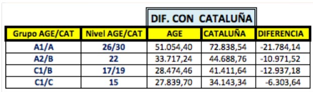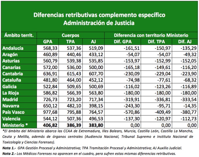 Según denuncia CSIF, "esta circunstancia provoca la paradoja de que, siendo cuerpos de carácter nacional y realizando las mismas funciones en todo el territorio nacional, sus retribuciones varíen de un ámbito territorial a otro, llegando a diferencias de más de 550 euros según territorios y cuerpos", tal y como muestra el siguiente gráfico.
