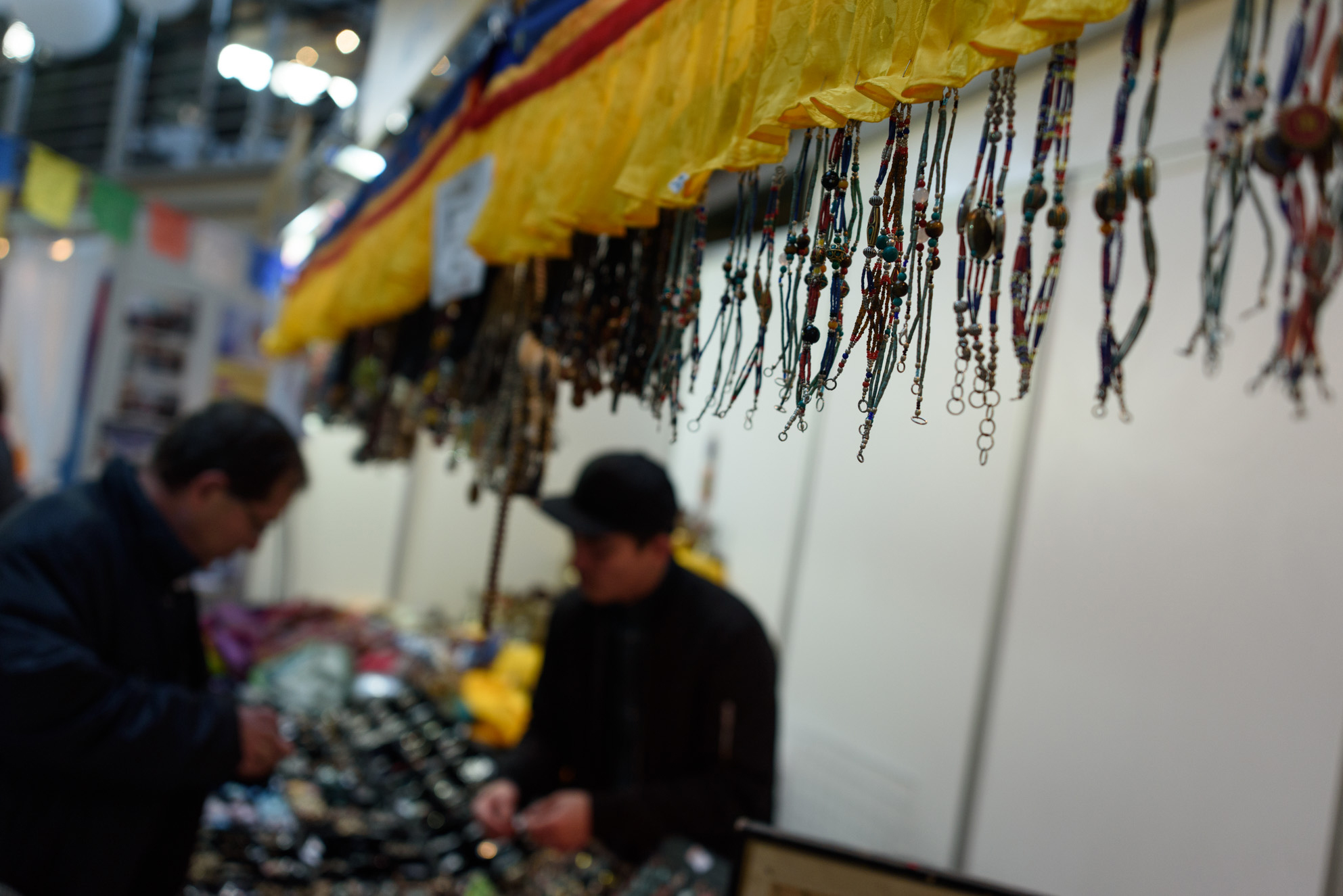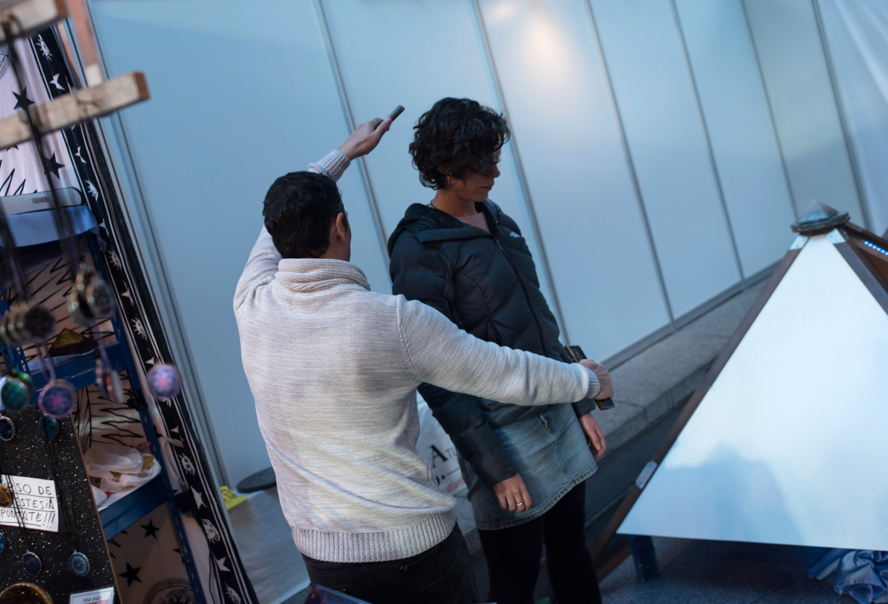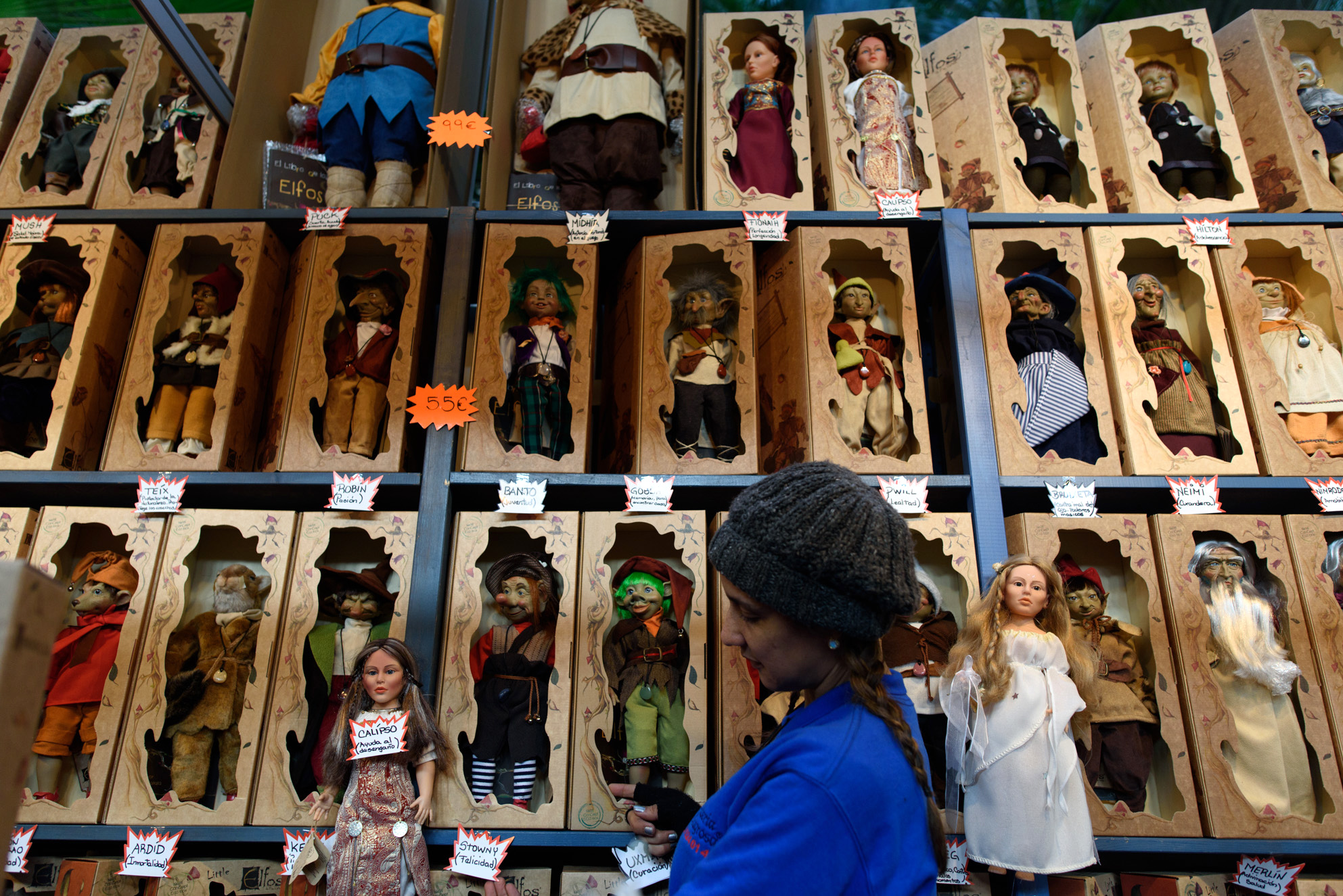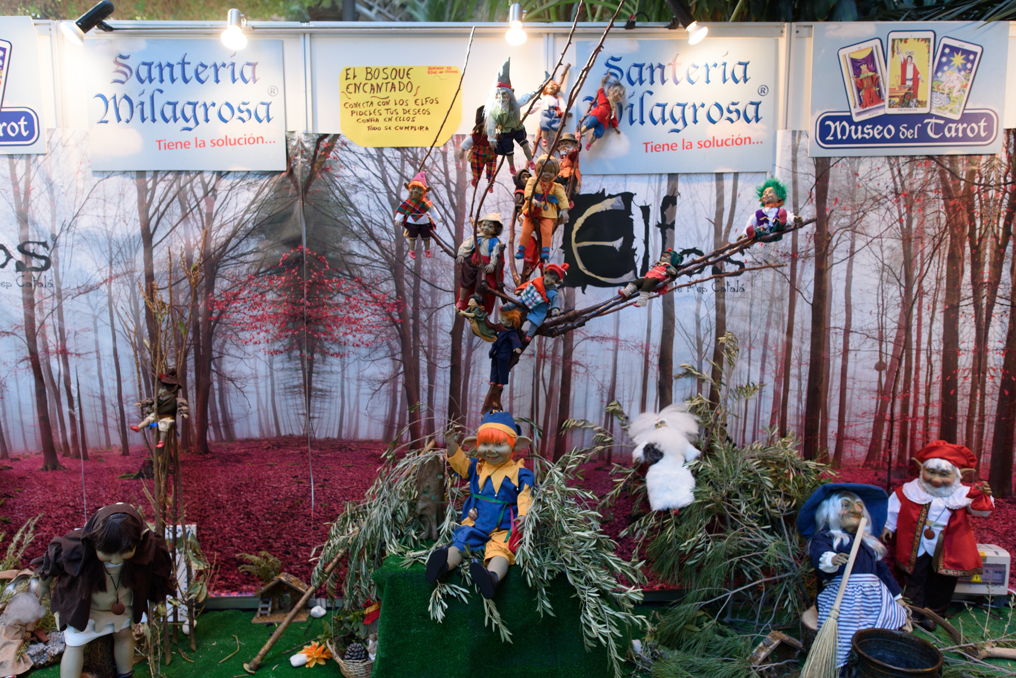 Santería la milagrosa, museo del tarot. Stand de la feria con varios muñecos elfos colocados.