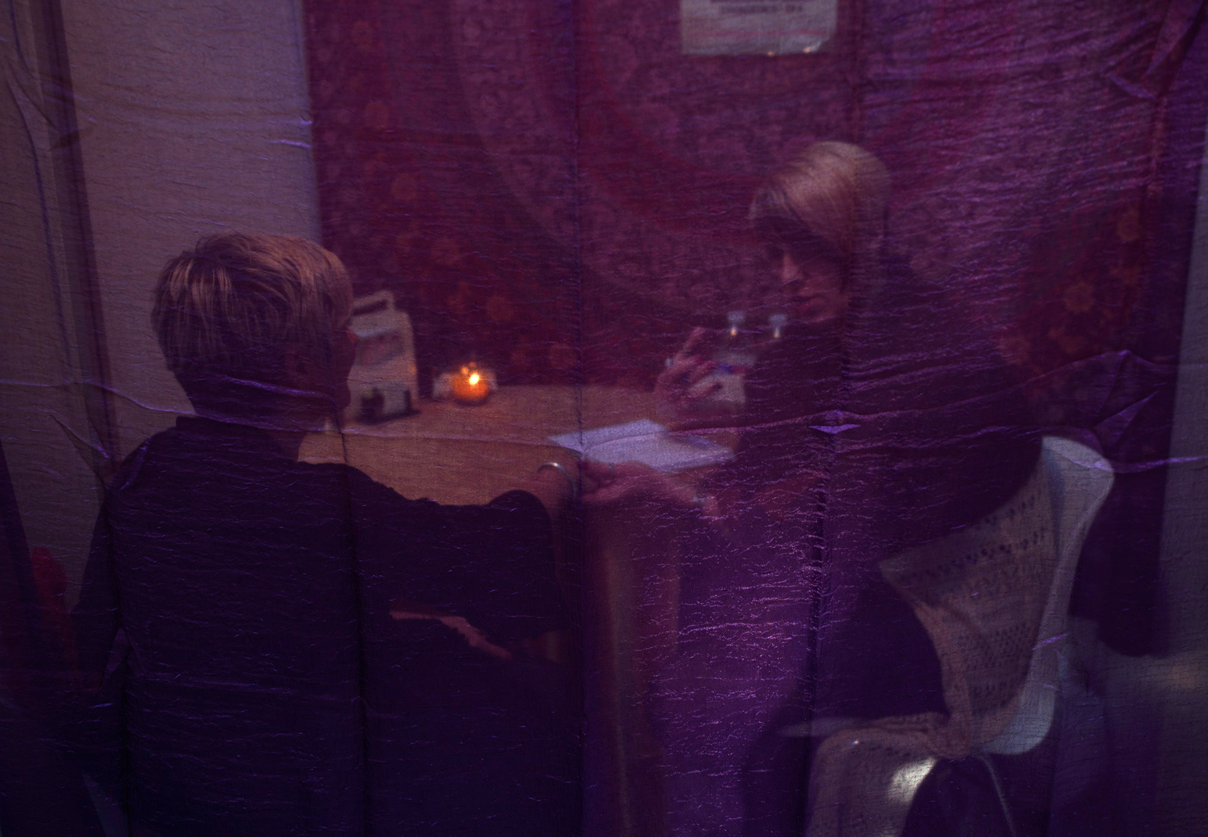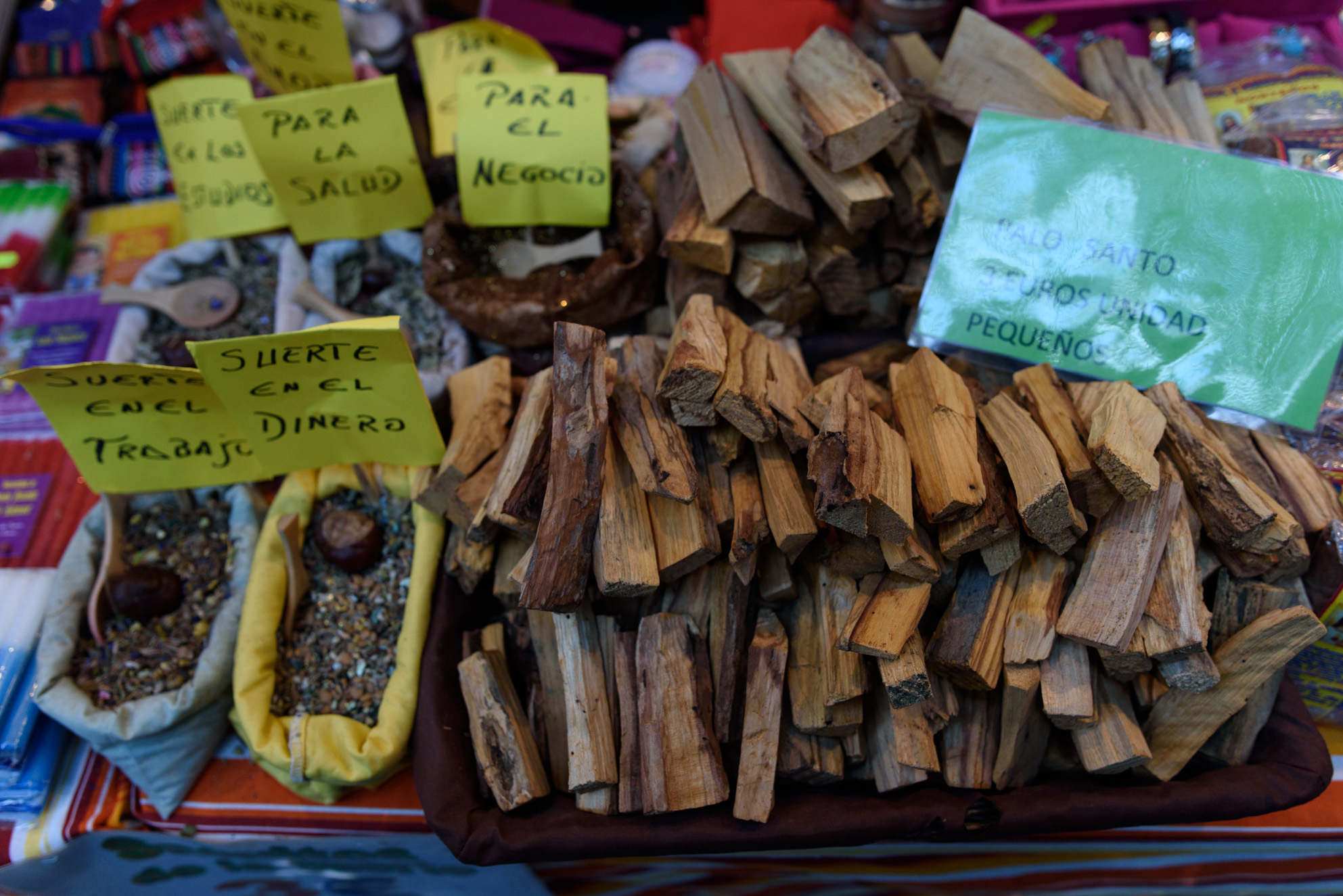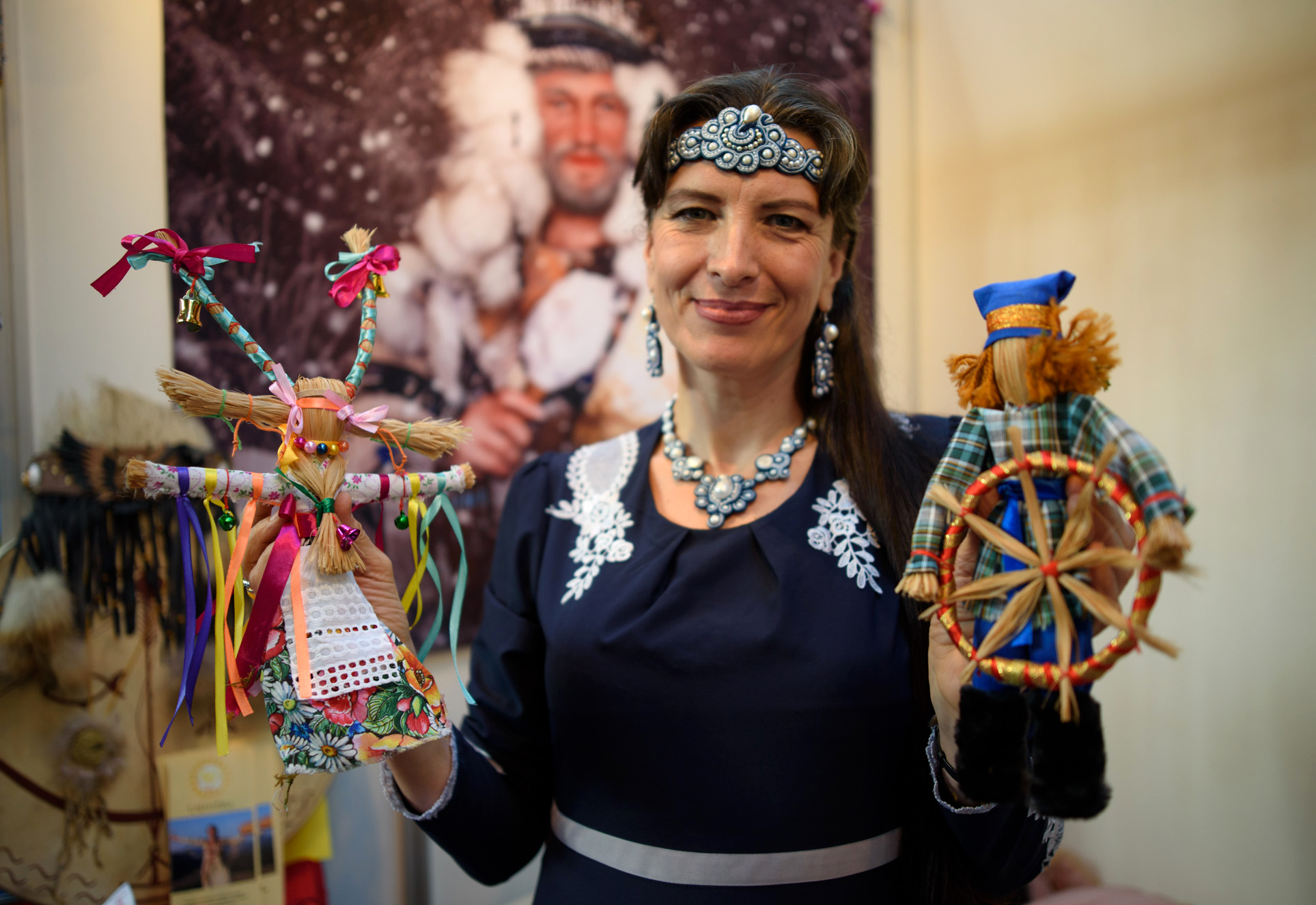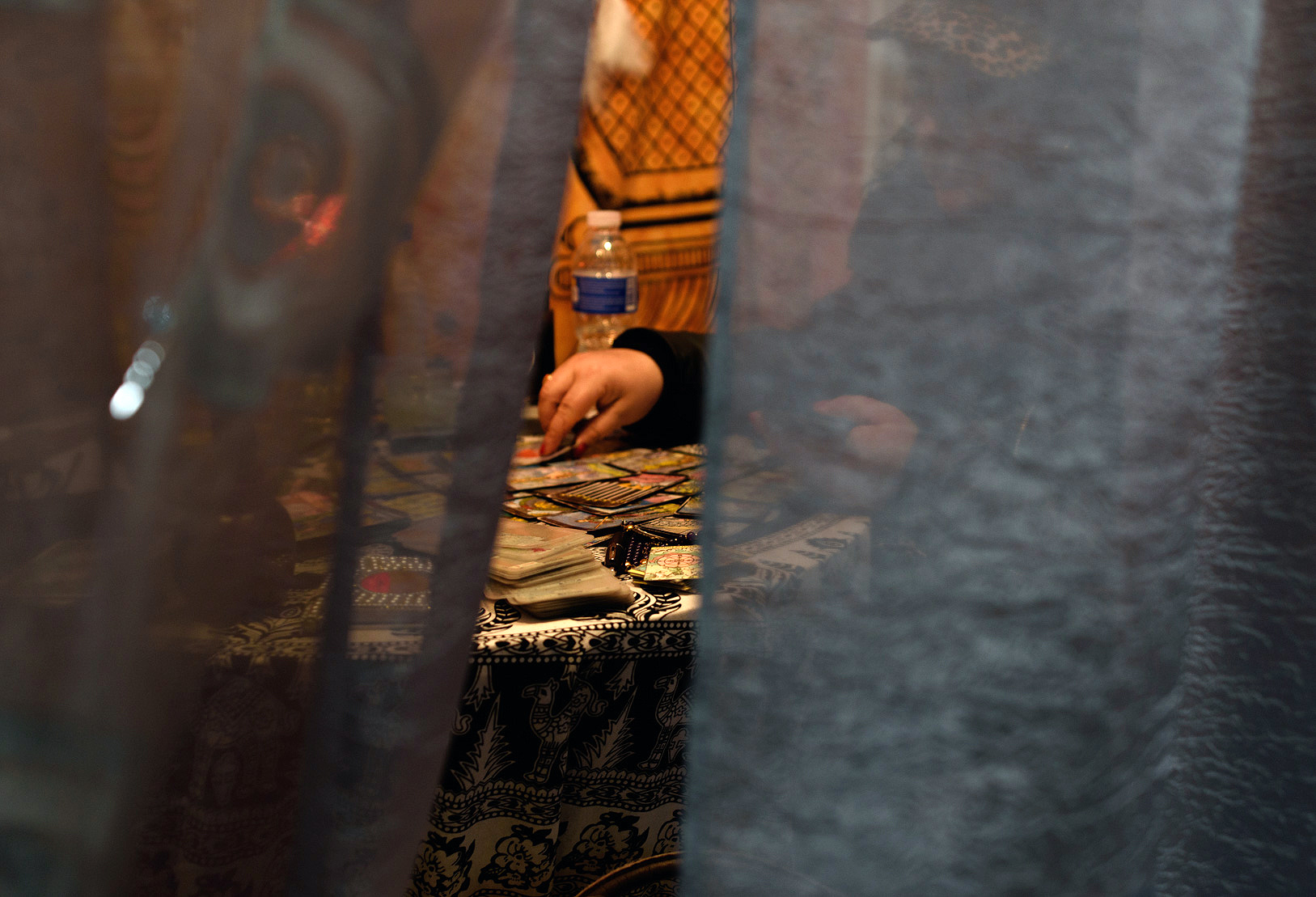 Santería la milagrosa, museo del tarot. Stand de la feria con varios muñecos elfos colocados.