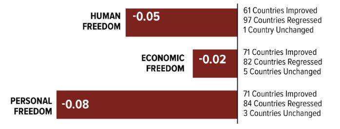El Índice de Libertad Humana publicado por el Instituto Cato aporta datos muy relevantes y, al mismo tiempo preocupantes. El mundo es menos libre ahora que en 2008 -el indicador global ha caído un 0,12-. En cuanto a la libertad personal, 84 países han sufrido progresos de regresión, un escenario similar se ha vivido en la libertad económica -donde 82 estados tienen un mercado menos libre que hace 10 años.