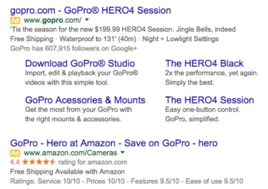 Imaginemos una campaña de publicidad de cámaras impermeables GoPro. Puedo, efectivamente, gastar dinero en publicidad de Google de cara a la gente que directamente busca mi producto. Así funciona Google: ¿ya sabes que quieres una GoPro?, aquí tienes algunos resultados: