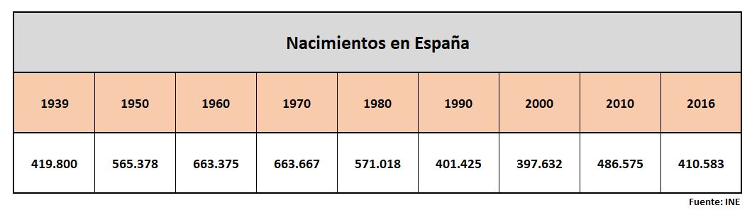 Algunos datos son escalofriantes: según publicaba hace unos días Eurostat, en 2016, las madres nacidas en España dieron a luz a 312.898 niños. Simplemente para que nos hagamos una idea de lo que eso significa: en 1939, con 25,5 millones de habitantes (20 millones menos que ahora), en el año final de una Guerra Civil (con lo que un conflicto de este tipo implica desde un punto de vista demográfico, sobre todo por su impacto entre los hombres jóvenes) que supuso cientos de miles de fallecidos, una ruina económica y el exilio para muchos otros miles… pues bien, en aquellas circunstancias, nacieron en nuestro país 419.800 niños: 107.000 más que en la actualidad (de madres nacidas en España).