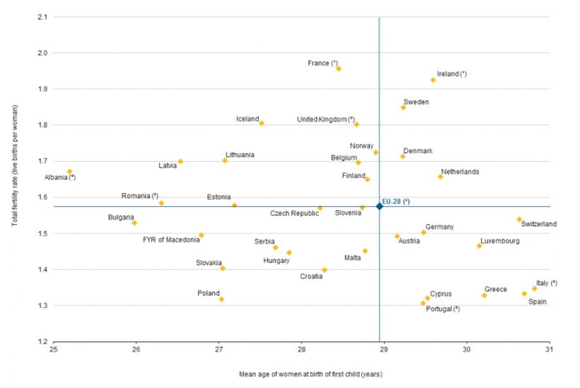 En el siguiente gráfico, puede verse como estamos en el peor de los mundos posibles. En el eje vertical, se distribuyen los países según su tasa de fertilidad (los que están debajo de la línea azul es que tienen un nivel inferior a la media europea). En el eje horizontal, según la edad de la madre cuando nace su primer hijo: a la derecha de la línea significa madres con más edad. España está en el por lugar, abajo (dato muy bajo en fertilidad) y a la derecha (madres muy mayores).