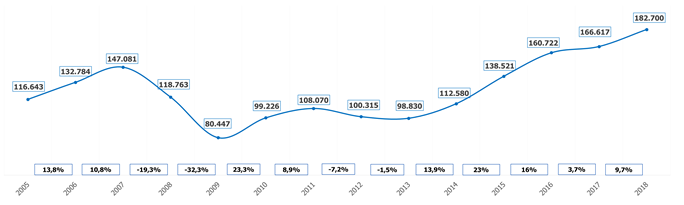 Entre 2010 y 2013 la campaña de Semana Santa se mantuvo en el entorno de las 100.000 incorporaciones, con ligeras subidas y bajadas. Sin embargo, desde 2014 se han registrado cinco años de crecimiento consecutivos, hasta los 182.700 contratos previstos en 2018.