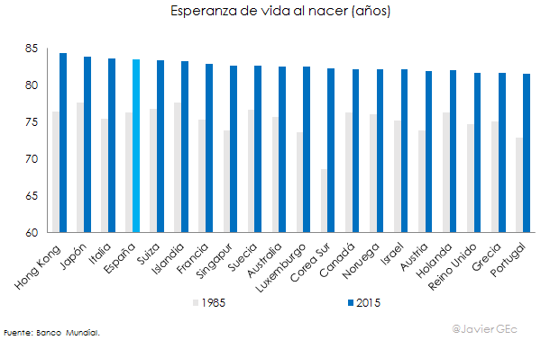 La población española destaca por su longevidad. Un español vive 83 años de media, únicamente menos que los habitantes de Hong Kong, Japón e Italia, según datos del Banco Mundial. Los españoles viven mucho y cada vez más, ya que la esperanza de vida ha crecido en siete años desde 1985 a 2015.