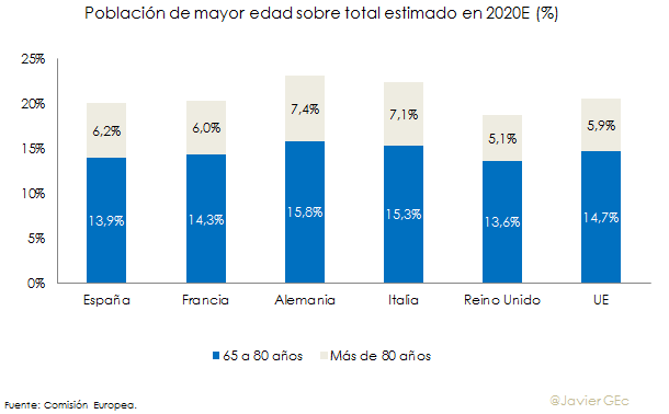El progresivo envejecimiento demográfico convierte la salud y su financiación en una cuestión cada vez más relevante. Según las estimaciones de la Comisión Europea, un 14% de la población española en 2020 tendrá entre 65 y 80 años, y un 6% 80 años o más, 2 puntos más que en 2013. A más largo plazo, la proporción de población con 80 años o más ascendería al 10% en 2040.