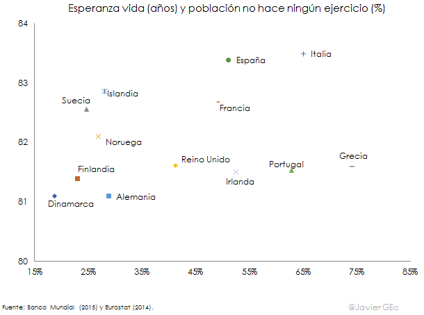 Otro parámetro de referencia sobre la salud es la actividad física. En este caso, la comparativa tampoco resulta favorable, dado que algo más de la mitad de los españoles no hace ningún ejercicio, muy por debajo de los países nórdicos. Dicho lo cual, y dentro de los países con un clima similar, griegos italianos o portugueses dedican incluso menos tiempo.