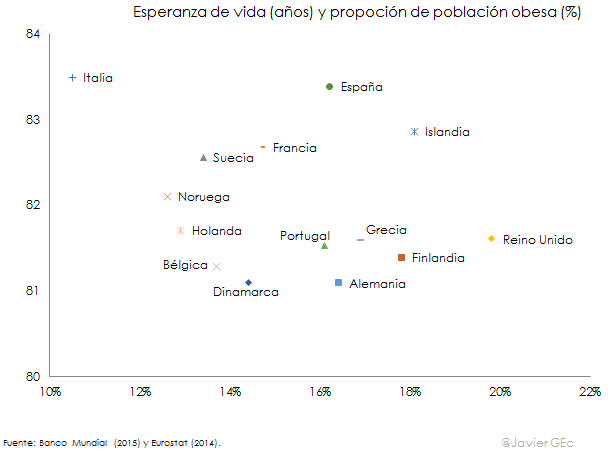 Por último, en España, uno de cada seis habitantes es obeso, nivel ligeramente superior al 15% del promedio de la Unión Europea o al 11% de Italia. Tampoco la masa corporal es un positivo indicador de salud para los españoles.