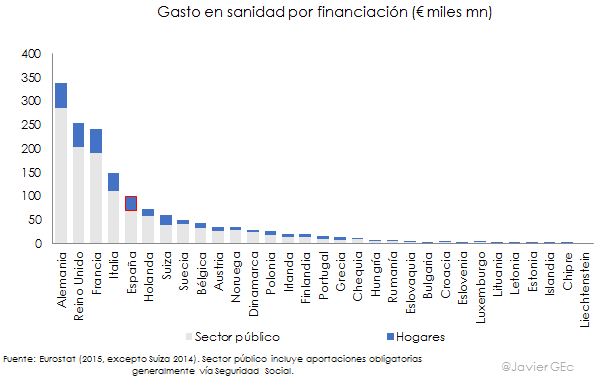Pero siendo el gasto total moderado, lo más significativo es la partida destinada a medicamentos -aquí se incluye también el gasto en equipos y material médico-, ya que supone el 22% del total, el octavo más alto de Europa, por encima de Reino Unido o Italia.