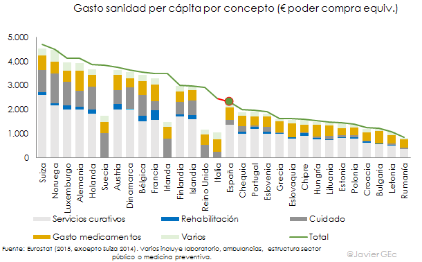 Una comparativa per cápita, y ajustado por el poder de compra de cada país, muestra como en España el gasto se sitúa en la parte media, ocupando la posición 16, por debajo de las economías más comparables con la española. En concreto, el gasto sanitario per cápita en España se sitúa en 2.300 euros al año, menos que Reino Unido o Italia -también por debajo de la cota de 3.000 euros-, Francia -3.500 euros- y Alemania- algo más de 4.000 euros-. Aparte de Alemania, en la parte alta del ranking se situán Suiza y los países nórdicos.