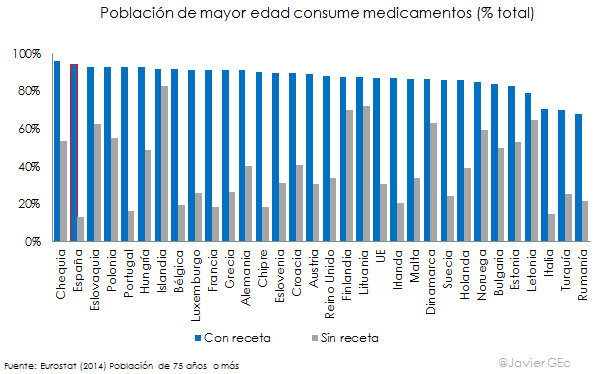 Y dentro del consumo de medicamentos, resulta relevante que mientras un 93% de la población española de más edad consume medicamentos con receta -únicamente por detrás de los checos en Europa- tan sólo el 13% lo hace sin ella -la menor tasa en Europa-.