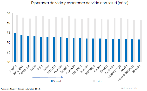 Existe un indicador de longevidad más cualitativo que toma en consideración los años que en promedio la población vive con buena salud o en ausencia de enfermedad. En este caso, los españoles pierden cinco posiciones en el ranking internacional de longevidad, al tener su población una vida libre de enfermedades de 72 años y los 11 restantes con problemas de salud, superior en año y medio al promedio de los países que le preceden.