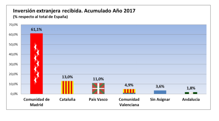 Por lugar de destino, la Comunidad de Madrid atrajo 14.500 millones, lo que representa el 61% del total de la inversión extranjera neta, tras crecer un 25%, seguida de Cataluña, donde fueron a parar 3.000 millones de euros, un 40% menos que en 2016.