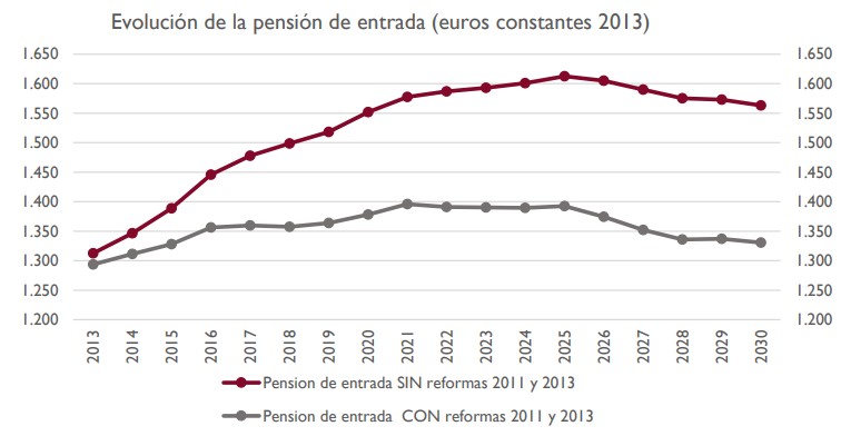 Así, tal y como recoge la documentación que entregó la Autoridad Independiente de Responsabilidad Fiscal (AIReF) a la comisión del Pacto de Toledo, durante la comparecencia de su presidente, José Luis Escrivá, en febrero de 2017, la pensión de entrada (inicial) rondaría los 1.550 euros a precios constantes en 2030 si no se hubieran aprobado las dos reformas citadas, frente a los poco más de 1.300 euros que recibirán tras dichos cambios, equivalente a una pérdida del 17% a medio plazo.