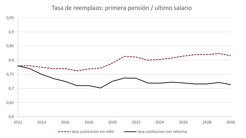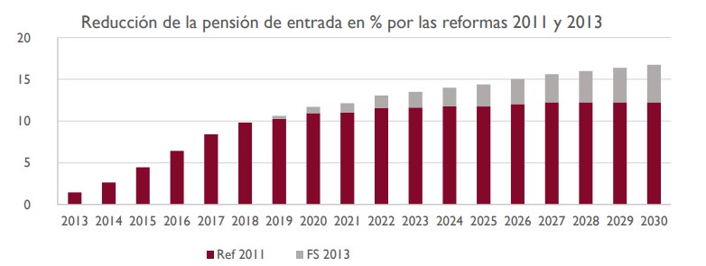 El 75% de dicha reducción se debe a la reforma socialista 2011, mientras que el 25% restante procedería de la aplicación del Factor de Sostenibilidad detallada en la reforma del PP en 2013 (el Índice de Revalorización permitiría contener, posteriormente, el aumento del gasto en pensiones).