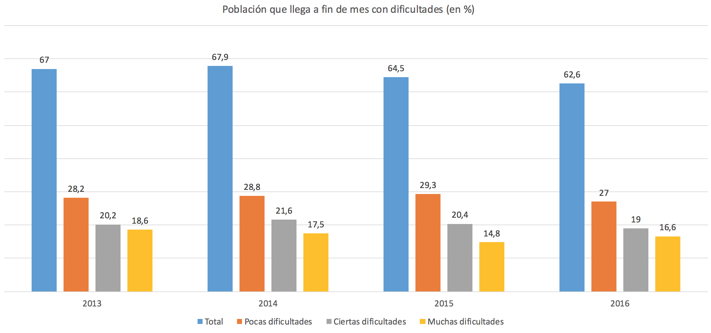 Un año después, en 2014, el porcentaje total había subido hasta el 67,9%, un leve repunte de 0,9 puntos. Dentro de esa tasa, un 28,8% decía enfrentar pocas dificultades, un 21,6% confesaba que lidiaba con ciertas dificultades y un 17,5% afirmaba que llegaba a fin de mes con muchas dificultades.