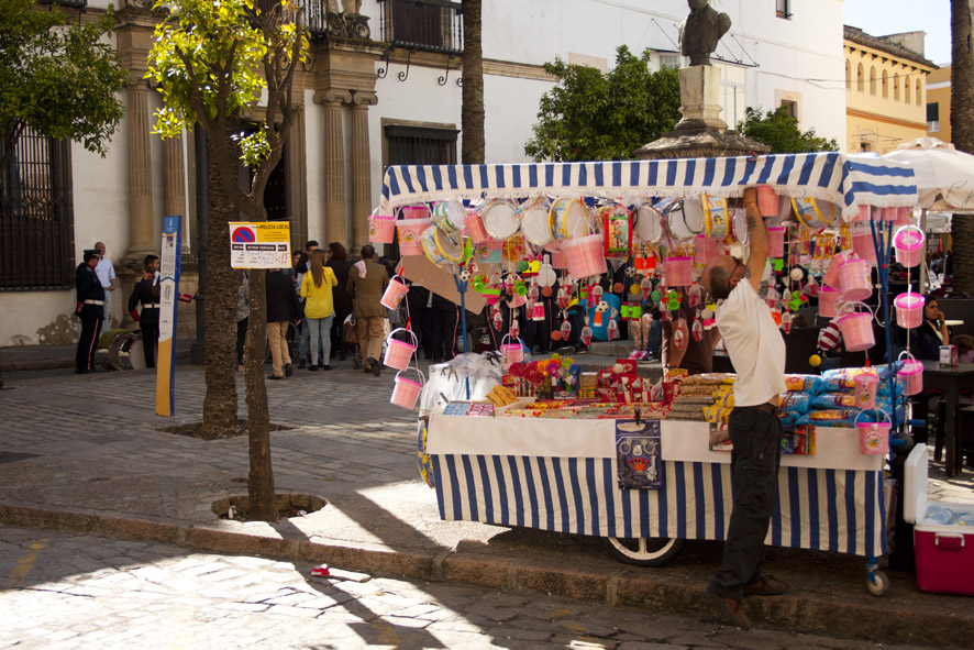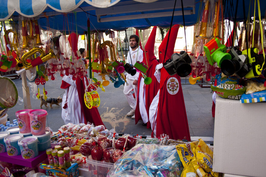 Una niña tira de la mano a su madre mientras sujeta con la otra la novedad de este último año: nazarenos de chocolate y caramelo son sujetados con un palito a modo de "Chupa Chups". Otros prefieren gastarse el dinero en merchandaising cofrade: "Dame una virgen y dos de Jesús", pide una mujer muy arreglada en una tienda improvisada con santas estampitas, ideales para llevar en el bolsillo o la cartera. Se vende de todo: figuritas, incensiarios, llaveros, imanes y hasta un recortable Cofrade para que los niños no se aburran mientras llega Jesús.