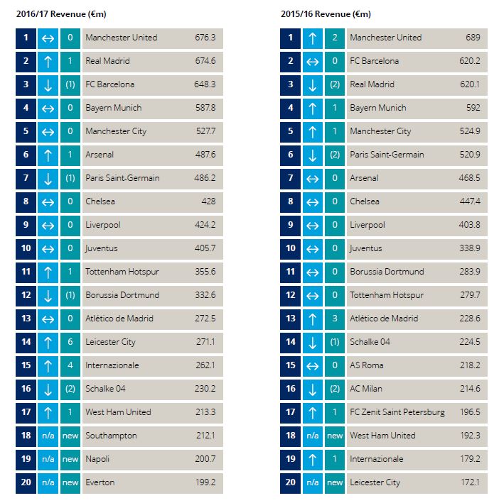 Desde hace unos años, el informe Deloitte Football Money League es el más citado cuando se analizan los ingresos de los grandes clubes (nosotros también usaremos sus cifras). Como apuntamos anteriormente, en su edición de 2018 (ver imagen de la derecha, click para ampliar) diez de los veinte equipos más ricos son ingleses (junto a tres españoles, italianos y alemanes, y un francés).