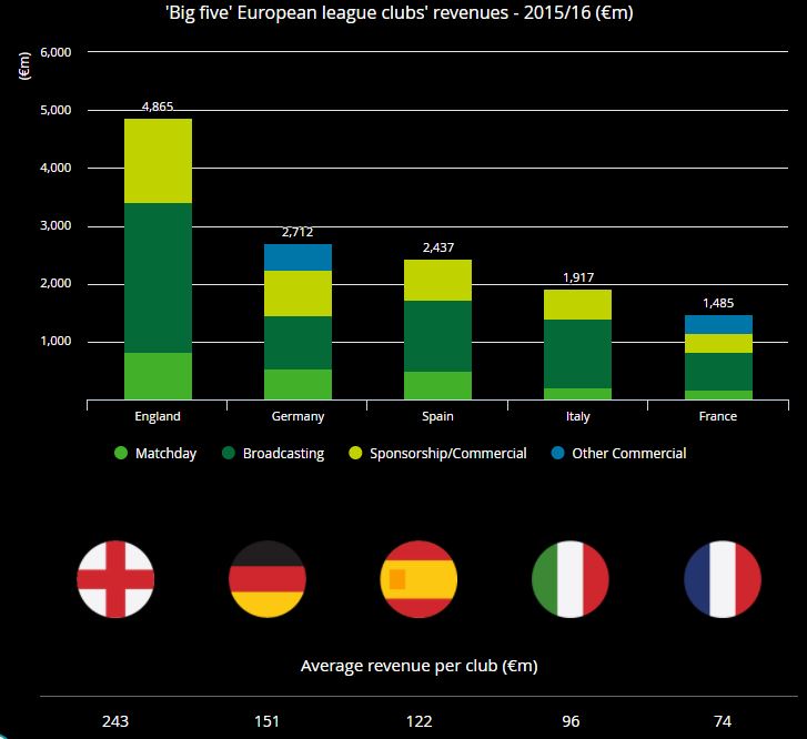 Sí, hay cierta competencia entre países en el top 7-8: Manchester Utd – Real Madrid – F.C. Barcelona – Bayern Munich – Manchester City – Arsenal – PSG... pero a partir de ahí, se disparan las diferencias: la clase media-alta del fútbol es inglesa. Y eso hace que casi cualquier equipo de mitad de tabla de la Premier tenga unos ingresos superiores al 90% de los clubes alemanes, españoles, franceses o italianos.