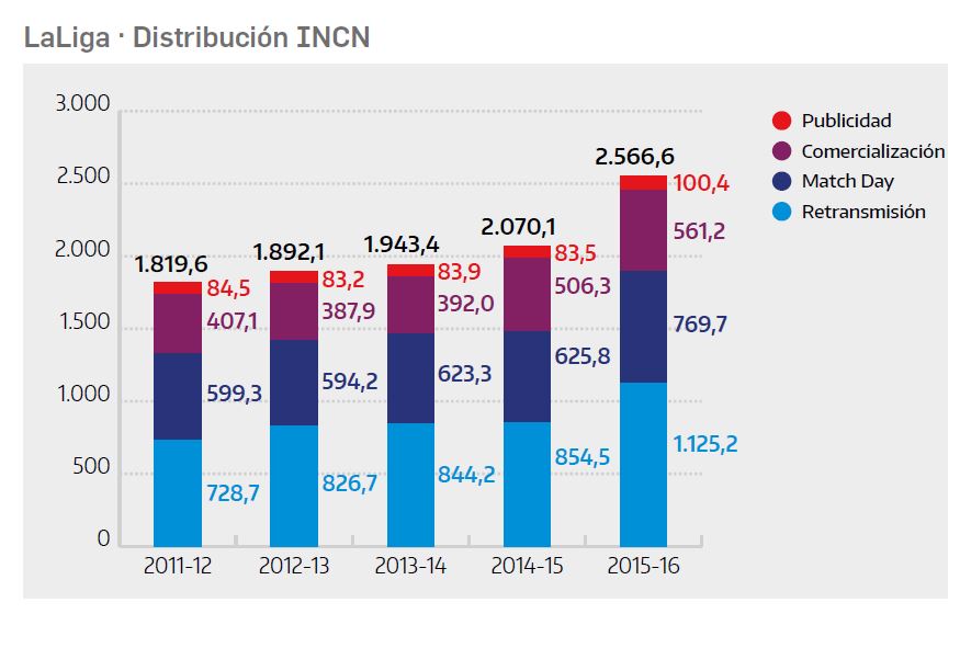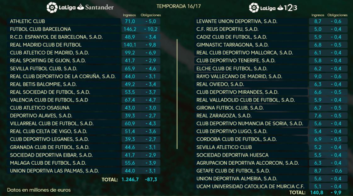 Según el Informe Económico Financiero del Fútbol Profesional 2016, publicado por la LFP, los clubes españoles de Primera División ingresaron, en la temporada 2015-16, más de 2.393,5 millones (sin contar traspasos de jugadores):
