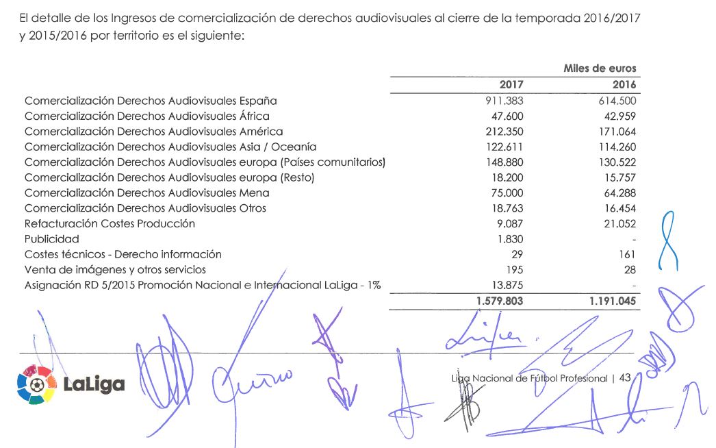 También es cierto que aquí entran en juego los derechos internacionales. Una partida presupuestaria que hasta hace unos años era marginal y que va ganando terreno cada día. En la Premier, 789 de los 2.398 millones de libras obtenidos de las televisiones llegan del extranjero (un 33%). Para La Liga la cifra es incluso un poco superior: el 40% del total de lo que se recauda por derechos televisivos llega del extranjero (ver cuadro de la derecha con el detalle de lo que pagan los diferentes mercados de acuerdo al Informe de Auditoría de la LFP 2016-17 – la cifra total de este cuadro es superior a los 1.246 millones que se reparten los clubes porque incluye lo que se destina a Segunda y los gastos de comercialización y gestión de los derechos).