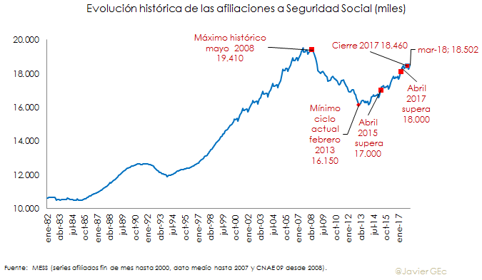 Los registros de la Seguridad Social de marzo, tras crecer en 139.000 afiliaciones (frente a los 161.000 estimados inicialmente), se sitúan en un total de 18,5 millones, lo que apunta a que el hito de recuperar la cota de los 19 millones se podría lograr en el segundo trimestre del año, gracias al crecimiento de la economía y a la estacionalidad de la actividad en los próximos meses.